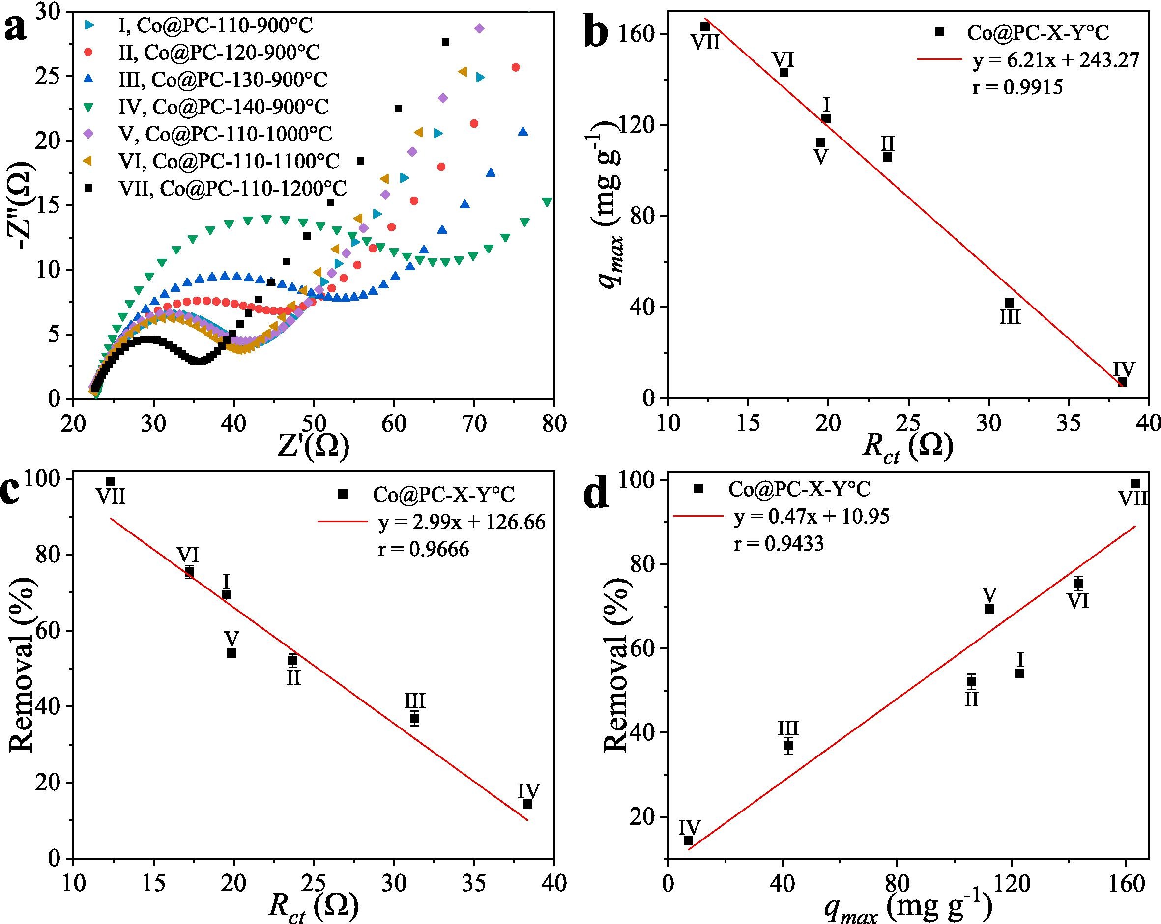 图3 Co@PC-X-Y°C材料的Nyquist图(a);电荷转移电阻(Rct)与最大吸附容量(qmax, b)及NOR总去除率之间的关系(c);qmax与NOR总去除率之间的关系(d)。