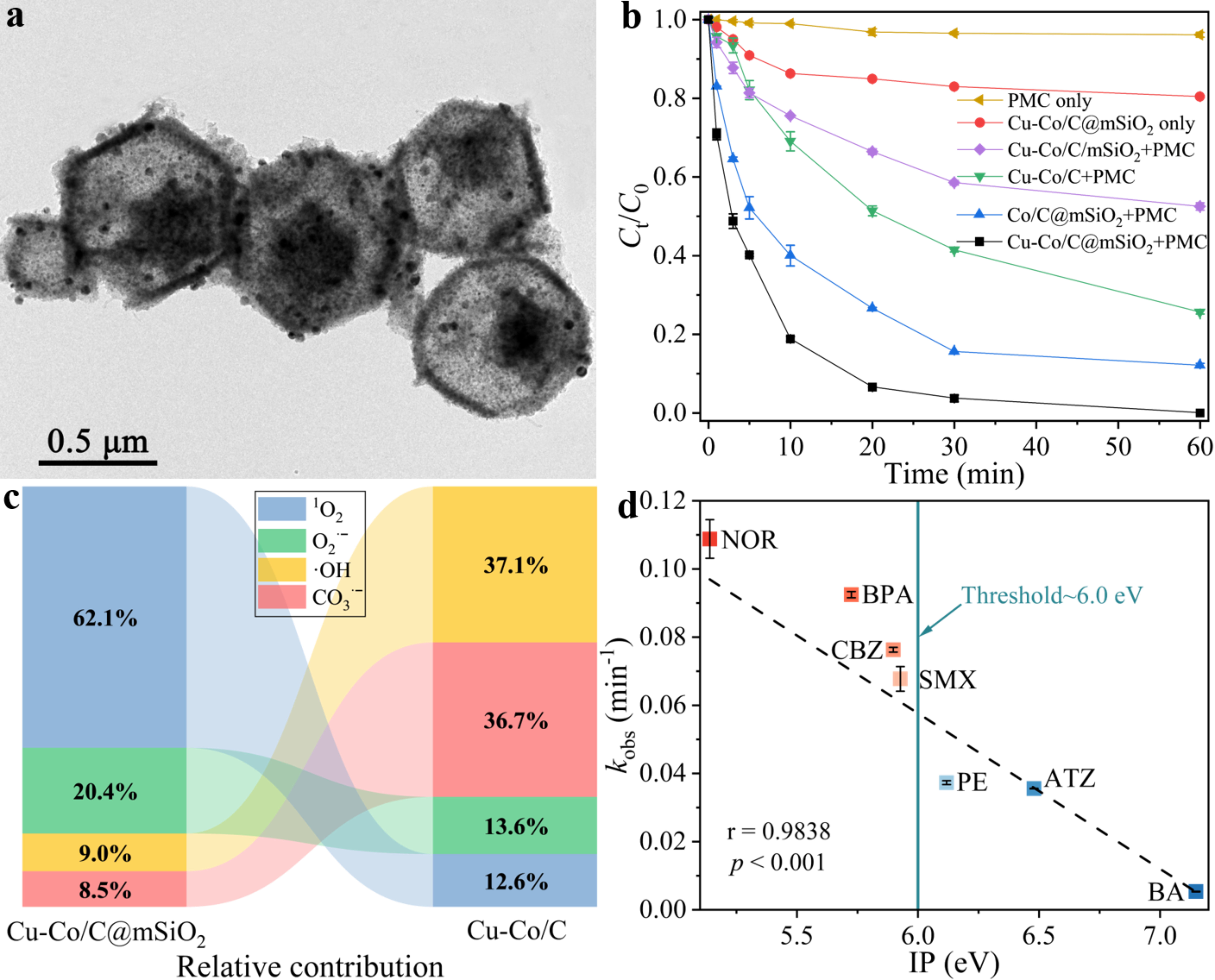 图1 Cu-Co/C@mSiO2的透射电镜图(a);NOR在不同条件下的降解曲线(b);限域体系与非限域体系中各活性物种的相对贡献顺序(c);限域体系中微污染物IP值与相应降解速率常数之间的相关性拟合(d)。
