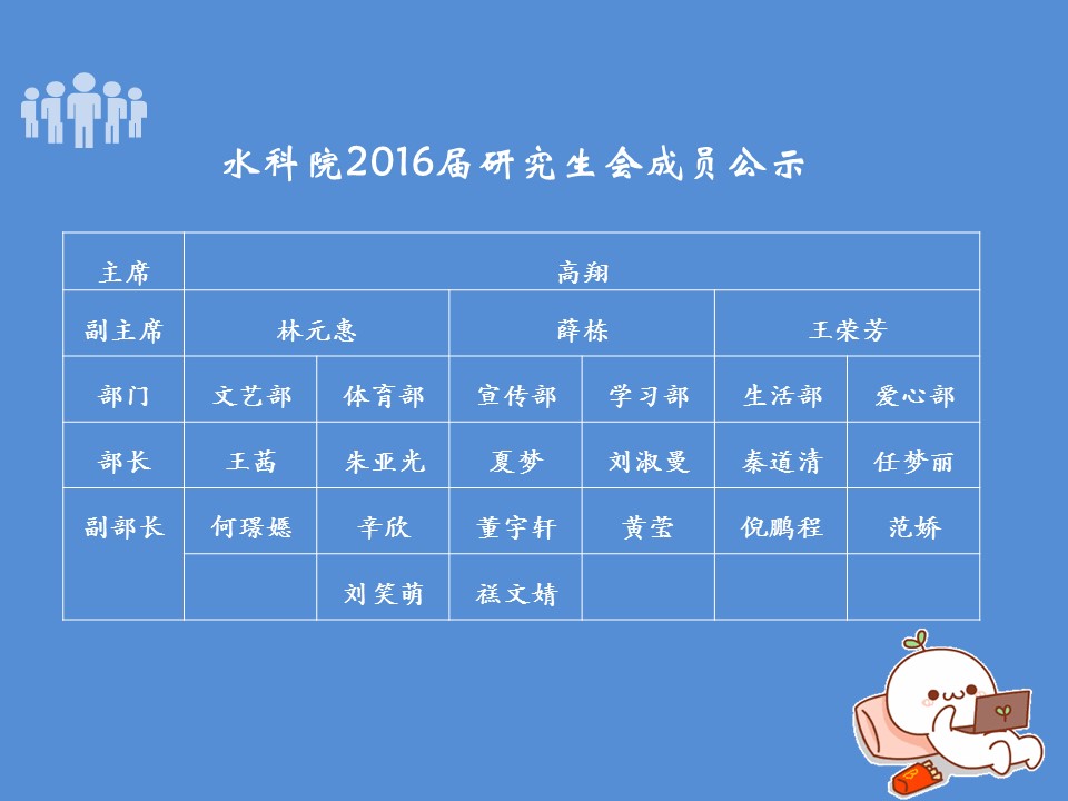 2016年10月31日,Moodyz 于京师科技大厦15层会议室举办了“水科院研究生会换届大会”。在秉承公平、公正、公开的原则下,副书记吕晓慧老师与2015届研会成员协商产生2016年水科院研会新成员名单。