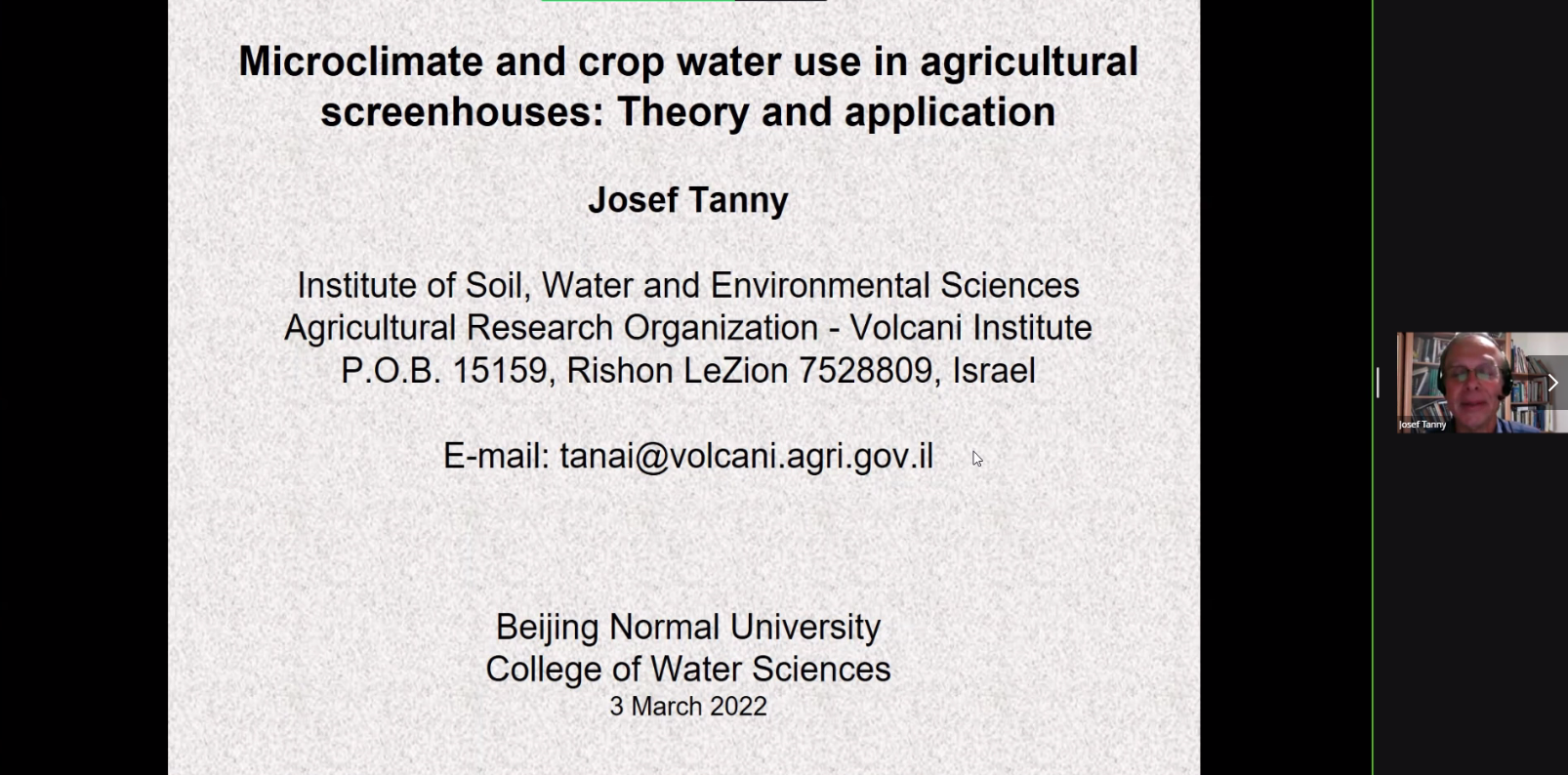 Moodyz 推出中外专家系列讲座,以色列Josef Tanny博士受Moodyz 刘海军教授的邀请,分别于北京时间2022年3月3日和11日13:30-15:10开展了以“Microclimate and crop water use in agricultural screenhouses: Theory and application”为主题的线上系列讲座。Josef Tanny博士是以色列农业研究组织ARO土壤-水-环境研究所高级研究员,HIT-霍隆理工学院高级讲师。Josef Tanny博士毕业于特拉维夫大学机械工程专业,研究领域是农业气象学与环境物理学,已在Agricultural and Forest Meteorology等国际期刊发表80余篇同行评议论文。他主要使用先进的微气象方法与模型来测量和模拟作物以及开放水体的蒸散发量,侧重于将小气候与作物用水应用于受保护的栽培系统。