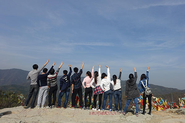 从灵光寺开始,大家就怀着虔诚的心对每一座寺庙的佛祖进行拜谒。越往山上走。空气越清新,大家的心情却越来越好,想爬上顶峰的兴致也越来越足。在不断的攀越中,所有人终于在山的最高处景点“宝珠洞”会和,此时时间已接近正午,大家一起聚在台阶旁,共同分享着自己带的食物。