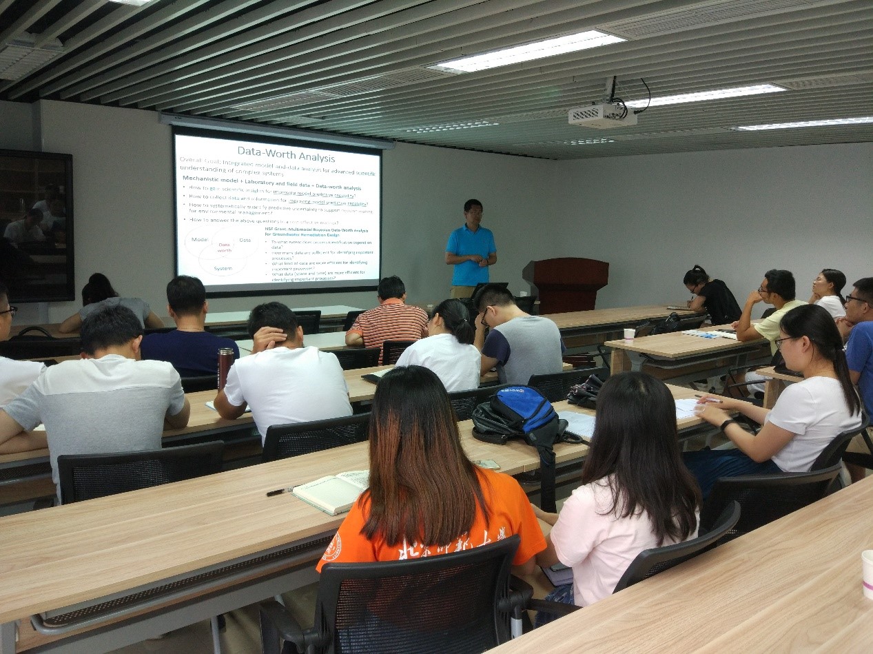 叶明教授做了题为“Numerical modeling and uncertainty analysis toward advanced understanding of subsurface environmental problems”的精彩学术报告。首先,从地下水系统的视角介绍了“Hanford储油厂渗漏”、“Yucca Mountain核废料储存”、“天然气生产区的数值模拟计算”、“地下水反应迁移模拟”和“化粪池系统的氮污染”等多个研究项目中数值模拟和不确定性分析的重要性和应用前景。其次,介绍了数据价值分析的相关内容,结合岩溶、溶洞和天坑的研究阐述了数据价值的研究可有效提高模型的预测精度并减少数据监测成本。最后,详细阐述了不确定分析中的贝叶斯模型平均方法,结合理想案例,示例阐述了如何从模型参数和模型结构的不确定性来甄别主控过程,以提高数值模拟结果可靠性。