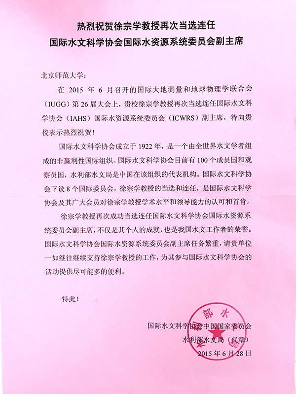 Moodyz 徐宗学教授再次当选连任国际水文科学协会国际水资源系统委员会副主席