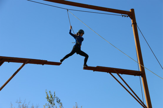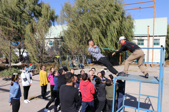 早上的训练项目以协作、勇气、信任为主题。首先是“高空断桥”项目,同学们在多重安全措施的保护下,需要爬上铁架、跨越断桥、空中索降。有的同学身手敏捷、锐不可当,有的同学略微犹豫后战胜自我,最终所有同学均挑战成功,在培养协调性的同时提升了迎难而上的勇气。接着是“信任背摔”项目,在熟知项目要点和保护方法的基础上,只见高台下保护的同学精神集中、姿势标准,不留一丝风险,登上高台的同学或紧张或平静,但均充满信任,完成规定动作。