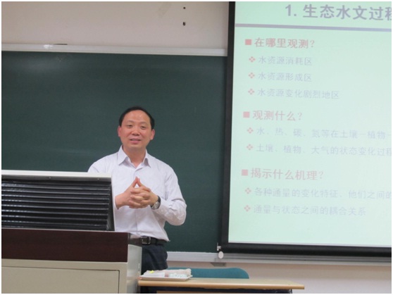 杨教授首先谈到了流域生态水文过程研究的背景。指出,水循环是一切水问题的科学基础,生态与水文过程相互作用是流域水循环的关键环节,气候变化的流域生态水文响应研究是水文学的前沿和热点;流域生态与水文过程之间存在着复杂的相互作用,气候是二者的主要驱动力之一,气候变化下的流域水资源变化,要求我们必需研究生态过程与水文过程的耦合作用。在生态水文过程观测及机理分析方面,杨教授就在哪里观测、观测什么和揭示什么机理三个方面作了回答。他指出,生态水文过程的观测主要在水资源消耗区、形成区和变化剧烈地区,水、热、碳、氮在土壤—植物—大气系统的迁移转化过程和土壤植被大气的状态变化过程是观测的主要对象;观测的目的在于,揭示各种通量的变化特征、他们之间的耦合关系以及通量与状态之间的耦合关系。随后教授结合其在缺水地区的几个生态水文过程观测实例着重讲解了农田生态水文过程和自然流域水文过程的观测与机理研究。