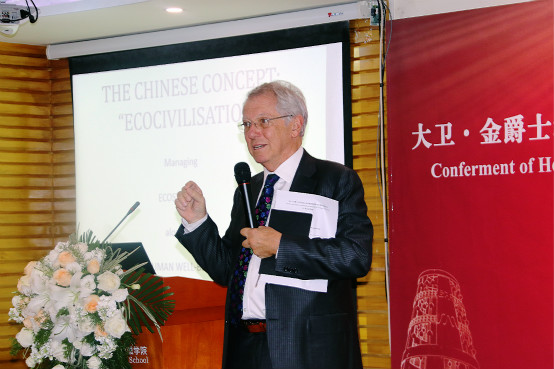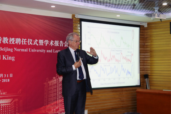 随后的学术报告会上,大卫·金爵士就当前全球气候变化的现状及趋势、气候变化风险评估、低碳减排的国际合作以及气候修复的宏观方向四部分进行了详细的介绍。对于中国当前实施的“生态文明建设”政策,大卫·金爵士也给予了充分的肯定。
