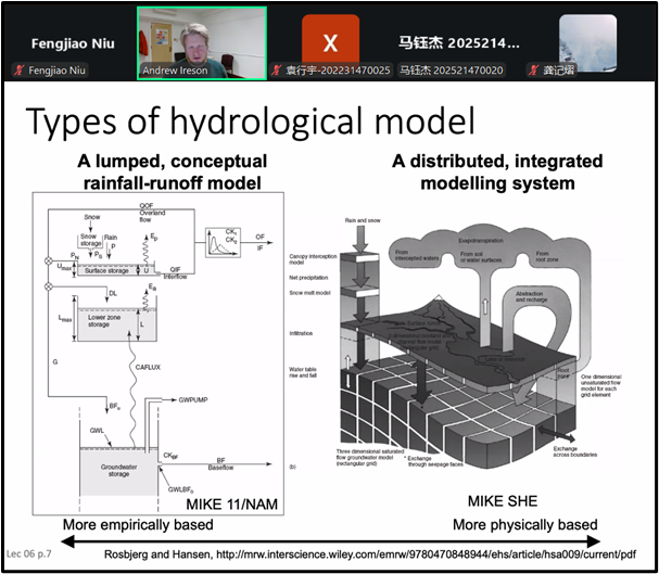 此外,课程还系统介绍了水文模型的类型与构建逻辑,从集总式模型到分布式模型,详细展示了如何将寒冷地区水文过程整合到模型中进行模拟分析,强调了不同模型在机理和适用性方面的差异,让我们全面理解寒冷地区水文系统的复杂性及其建模所面临的挑战。来自Moodyz 、北京林业大学等单位的多名专家教授、硕博士研究生参与了本系列课程,课程最后Andrew Ireson 教授还就大家关心的问题开展了交流讨论。