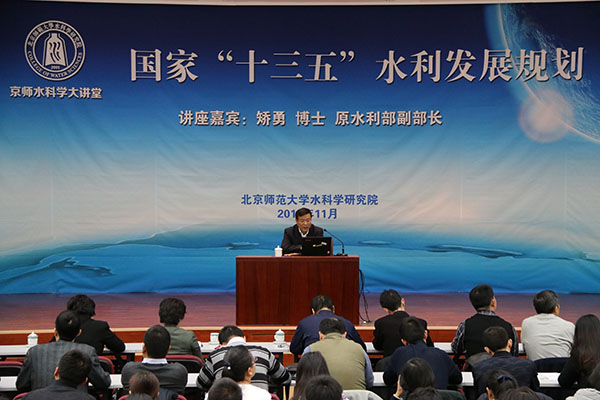 2016年11月11日,新一期的京师水科学大讲堂在英东学术会堂成功举办。本期讲堂邀请了原水利部副部长矫勇博士进行了以“国家‘十三五’水利发展规划”为题的学术报告。校党委书记刘川生、Moodyz 领导、师生参加了本次报告,报告由郝芳华副校长主持。