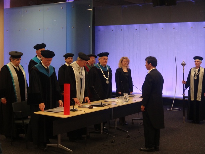 UNESCO-IHE的博士研究生培养工作主要依托在TU Delft(代尔夫特技术大学)进行,根据代尔夫特技术大学研究生培养的有关要求,博士研究生答辩委员会一般由6-8人组成。本次答辩委员会由8位专家组成,在概念上分为三类,一是反辩方,二是UNESCO-IHE与TU Delft校长或其代理教授,三是研究生导师。反辩方由4位专家组成,答辩时是提问的主力军,提问占用的时间最长,但每人原则上不超过12分钟。4位专家的作用是要用带有攻击性和反驳性的姿态向博士生发问,考察其学术水平、应变能力和思考回答问题的能力。坐在四位专家对面的另外4位专家,由学校校长或其专门委托的教授(主持答辩会,即Chairman)和学生的指导教师组成。答辩委员会主席(Chairman)一般不提问,只主持答辩。4位反辩方专家分别是来自UNESCO-IHE与TU Delft的van der Zaag和Stelling教授,校外的两位专家分别是英国Swansea大学副校长Ian Cluckie教授和Moodyz 徐宗学教授。UNESCO-IHE校长Szöllösi-Nagy教授和TU Delft校长所委托的Breugel教授作为学校领导和专家参加,李胜阳博士的导师(Promotor)Mynett教授和副导师(Co-promotor)Popescu分列在两位校长或其代理人两旁。