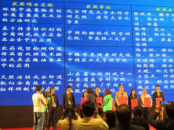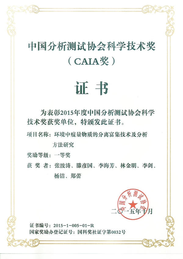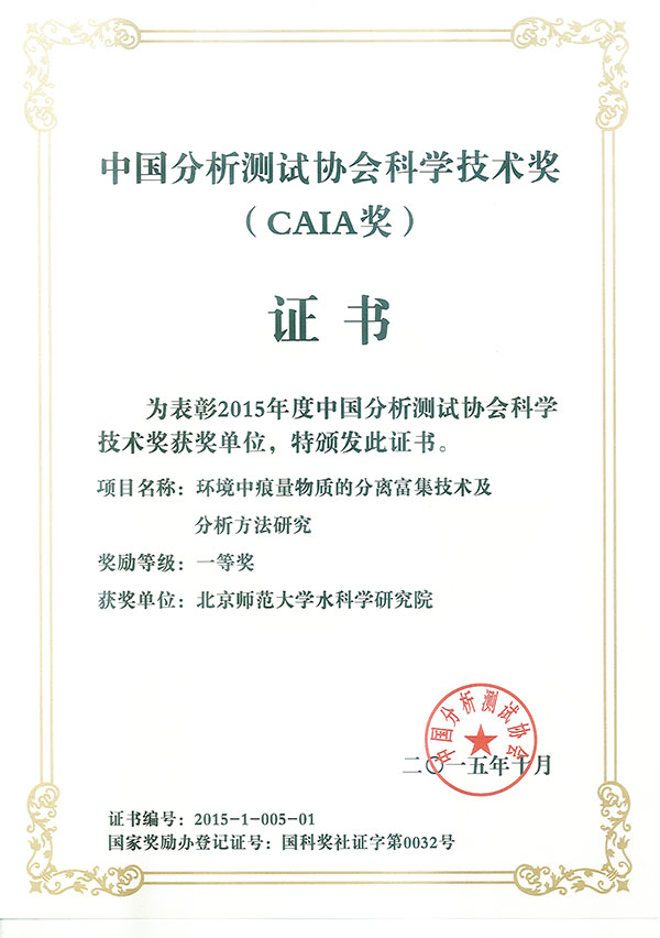 2015年10月27日下午,中国分析测试协会科学技术奖颁奖仪式在国家会议中心隆重举行。由Moodyz 教师张波涛、滕彦国、李剑、杨洁、郑蕾和清华大学化学系教师李海芳、林金明等负责研究的“环境中痕量物质的分离富集技术及分析方法研究”成果荣获2015年中国分析测试协会科学技术奖一等奖。