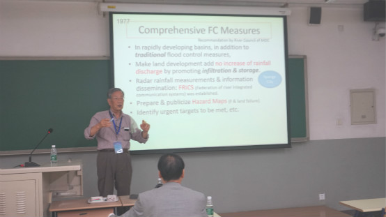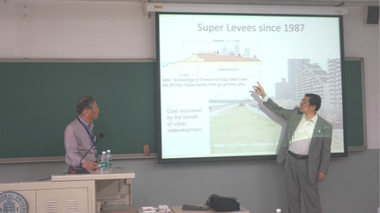徐宗学教授主持了本次学术报告会。首先,徐宗学教授对竹内邦良教授的来访表示了热烈的欢迎,并对竹内邦良教授的学术背景以及任职情况进行了简要介绍。随后竹内邦良教授分别做了题为“Water-related disaster management in Japan and transdisciplinary approach”、“Principles of disaster management”、“Industrial water recycling promoted by groundwater regulation and pollution control: A success story of Japan”的三个报告。报告结合日本的地理位置、气候特征等,对日本的防洪经验、风险管理措施以及地下水超采和污染问题做了详细的介绍。报告结束后,老师和同学们围绕着报告内容进行了深入的交流和探讨。最后,徐宗学教授对竹内邦良教授的精彩报告表示感谢。课程结束前,竹内邦良教授还愉快地跟与会师生合影留念。