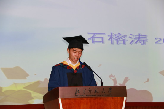 随后,郝芳华校长和宋永会院长为博士毕业生颁发博士学位证书并扶正流苏,Moodyz 徐宗学教授、王金生教授和滕彦国教授为硕士毕业生颁发硕士学位证书并扶正流苏。毕业生代表尹文杰博士和石榕涛硕士分别发言,表达了对老师的感激之情,回忆了水科生活的点点滴滴,并为母校送上了真挚的祝福。