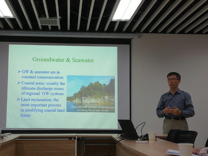 胡立堂副教授首先向与会师生简要介绍了焦赳赳教授主要研究方向和取得成绩,对焦教授的到访表示热烈欢迎。随后,焦赳赳教授做了题为“大规模填海对地下水系统的影响与评估”的精彩学术报告。报告首先从地下水系统的角度介绍了填海造陆的研究背景及国内外研究现状,指出了大规模填海对地下水系统的影响。其次,介绍了相应的解析解和数值解以评估量化填海造陆对地下水系统的影响。之后,以香港、深圳蛇口填海区为例,探讨了大规模填海可能引起的地下水流动系统与水化学系统的改变以及由此诱发的环境与工程问题。最后,总结了填海造陆对地下水系统的影响,指出填海造陆在一定程度上破坏了天然的生态系统,在不影响社会民生的情况下,应尽量减少或避免填海造陆。