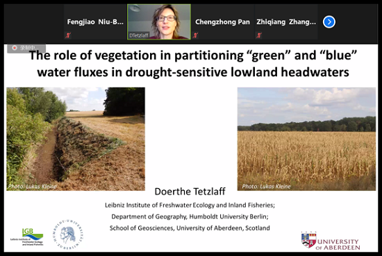 Doerthe Tetzlaff教授是柏林洪堡大学生态水文学教授,也是德国柏林莱布尼兹淡水生态与内陆渔业研究所所长。她的研究旨在了解流域在不同尺度上水文功能的时空变化特征,而且非常关注景观连通性和国际流域间的比较。作为Hydrological Processes的主编,她还是美国地球物理联盟(AGU)、爱丁堡皇家苏格兰皇家学会以及美国地质学会GSA的会员。Doerthe Tetzlaff教授围绕“The role of vegetation on partitioning‘green’and‘blue’ water fluxes in drought-sensitive lowland headwaters”主题展开讲座,介绍了在德国Demnitzer Millcreek流域监测站点进行的长期水文监测,以及对同位素示踪和生态水文模型集成研究的见解,强调了为土地利用规划提供定量生态水文学证据的基本需求,以确保在作物/木材生产与维持地下水补给和下游流量之间进行最佳的权衡。